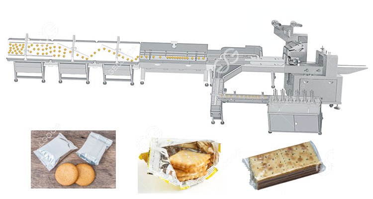 La máquina envasadora de galletas flow pack es adecuada para el envasado en forma de almohada de galletas, bizcochos, obleas y otros artículos diversos con formas regulares.